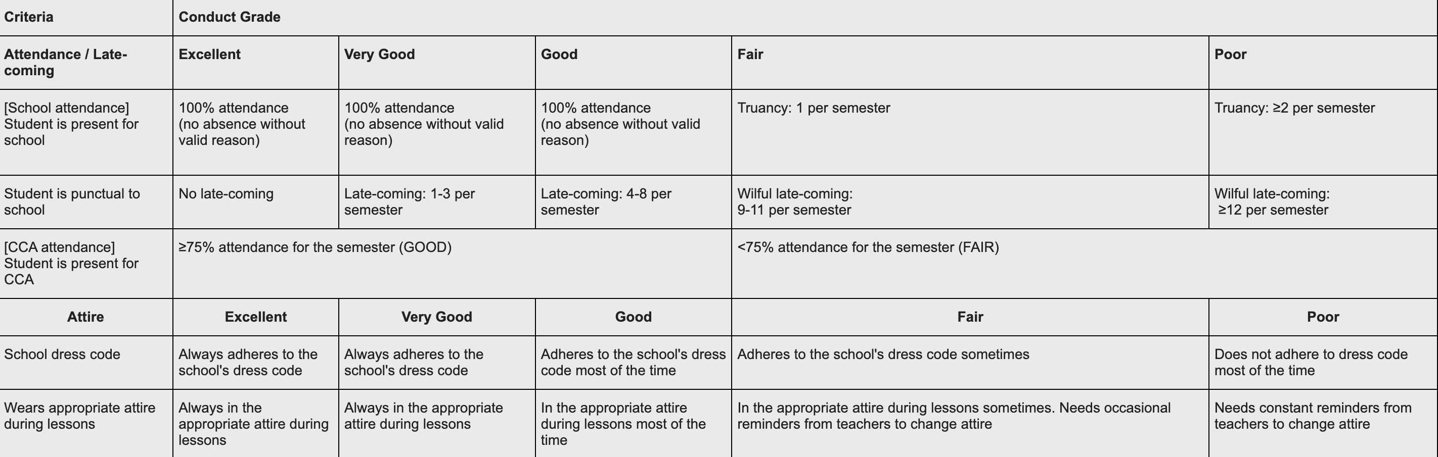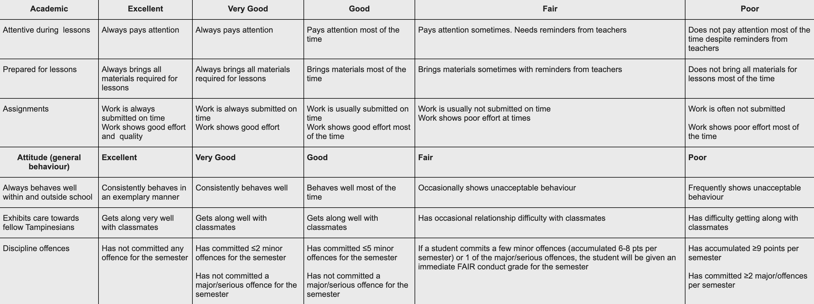 Please note that a Fair Conduct grade affects students’ eligibility for MOE Edusave and school awards.
